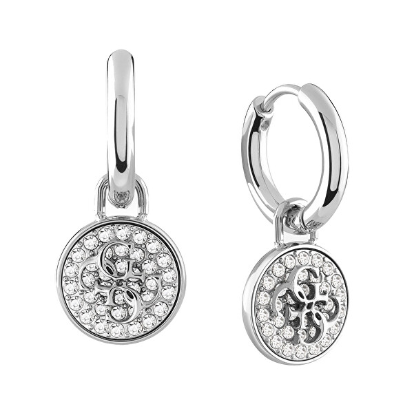 Náušnice Guess z chirurgickej ocele v tvare nadčasových kruhov s príveskami ozdobené trblietavými čírymi kryštálmi a 4G logom. Na druhej strane je nápis ´´LIVE YOUR DREAM´´. Zapínanie je kĺbové. Tento nežný šperk pozdvihne Vašu ženskosť.