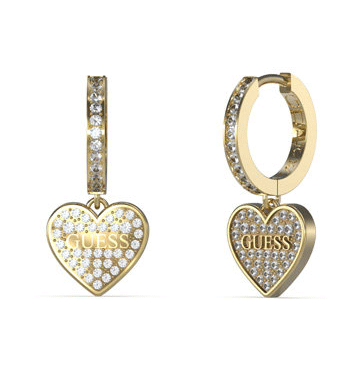 Módne dámske náušnice značky Guess vyrobené z ušľachtilej chirurgickej ocele v zlatom prevedení. Náušnice sú na kĺbové zapínanie s príveskom v tvare srdca ozdobené malými zirkónmi. Aj Vašu tvár môžu zdobiť tieto nadčasové náušnice s dĺžkou 2,5cm.