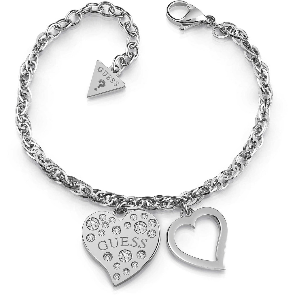 Módny dámsky náramok značky Guess vyrobený z ušľachtilej chirurgickej ocele v striebornom prevedení. Náramok má dva prívesky v tvare srdca, jeden je zdobený nápisom a zirkónmi a má dĺžku 2cm a druhý má dĺžku1,6cm. Náramok má nastaviteľnú dĺžku 15-19 cm. Aj vaše zápästie môže zdobiť tento nadčasový šperk.