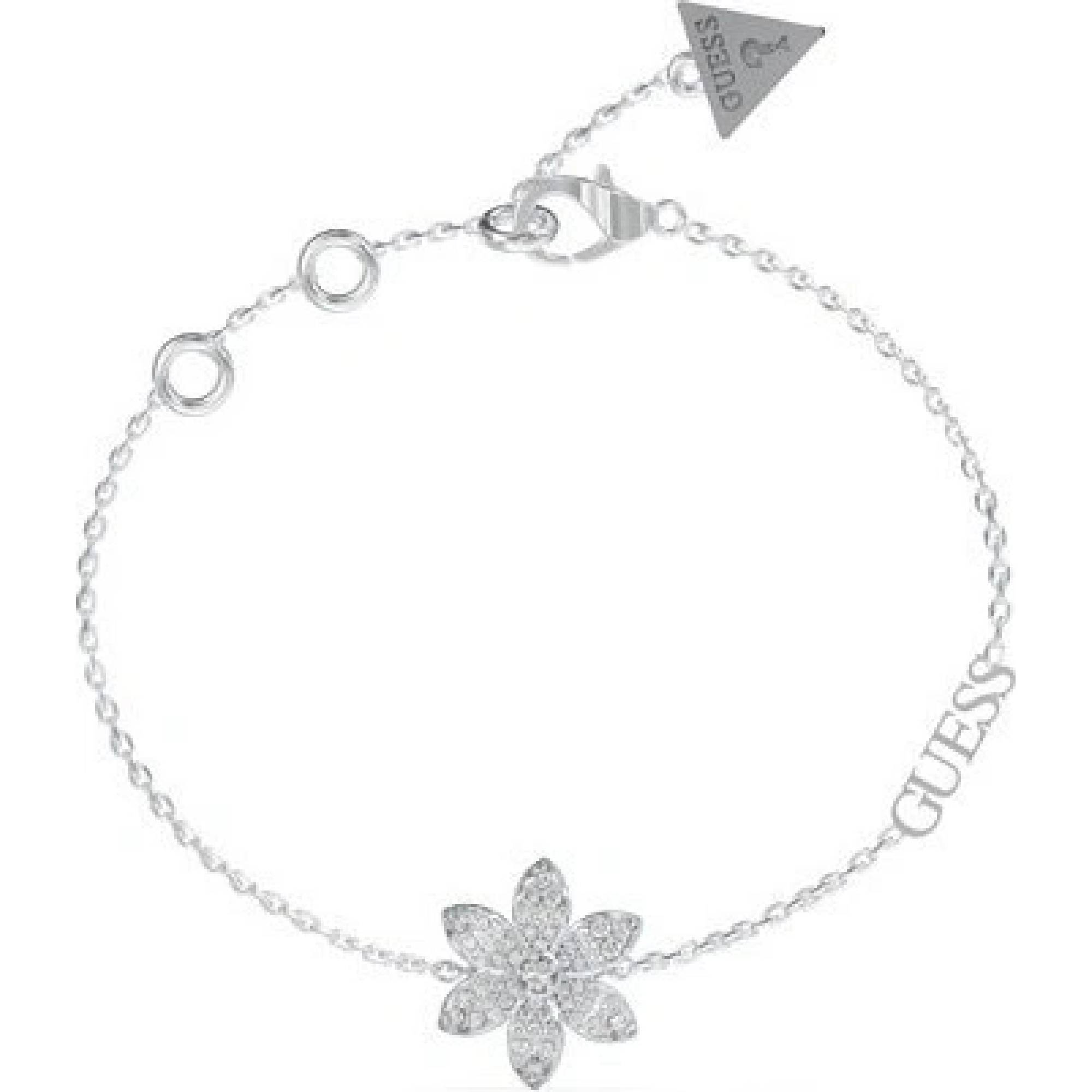 Dámský náramok Guess je vyrobený z ušľachtilej ocele v striebornej farbe. Dĺžka retiazky je 14,5 cm až 18 cm.  V strede náramku je prívesok v tvaru kvetiny so šiestimy okvetnými listami. Povrch listov je osadený drobnými zirkónmi a stred listu je zvýraznený väčšim guľatým zirkónom. Priemer prívesku je cca 16mm.