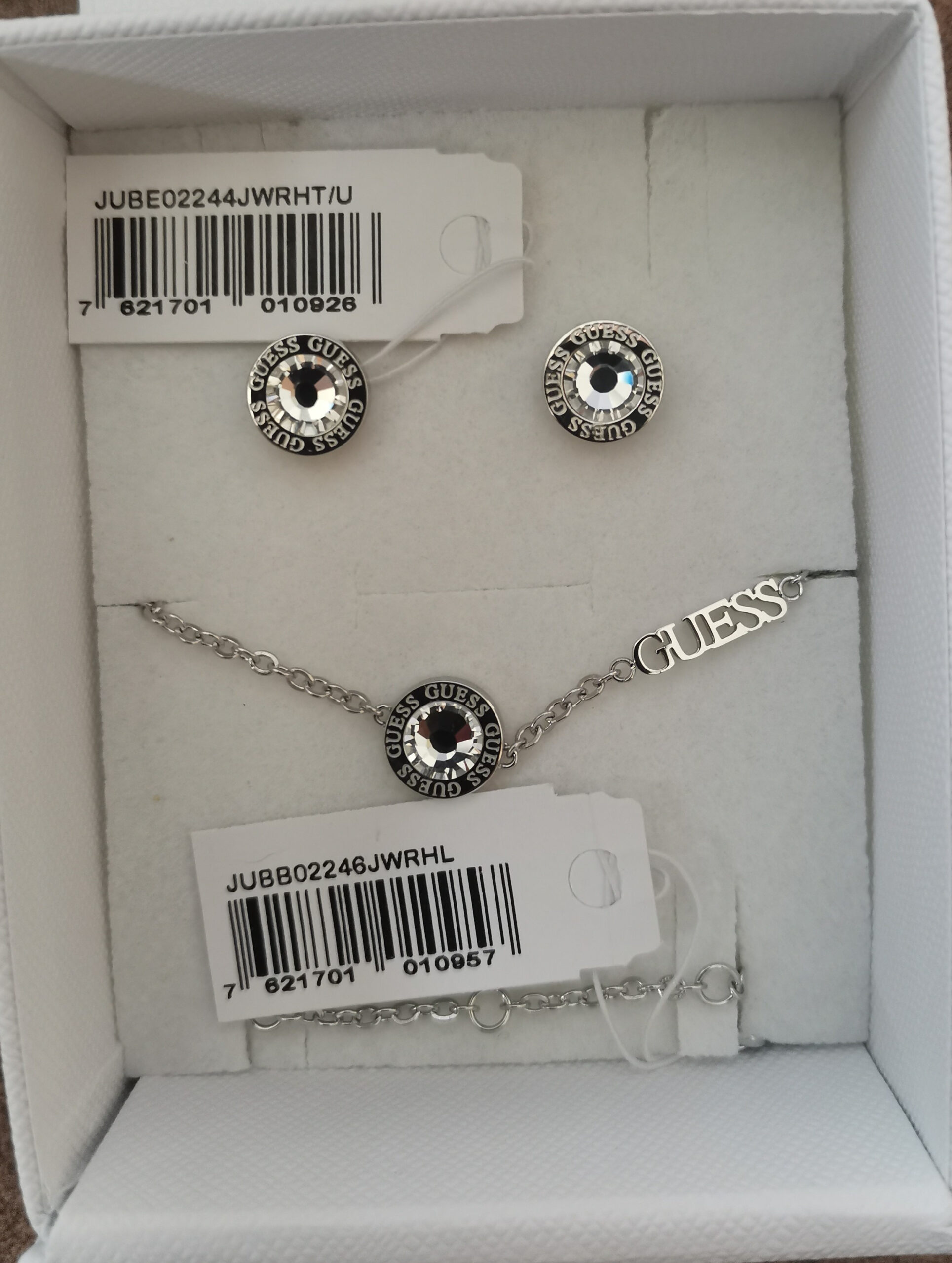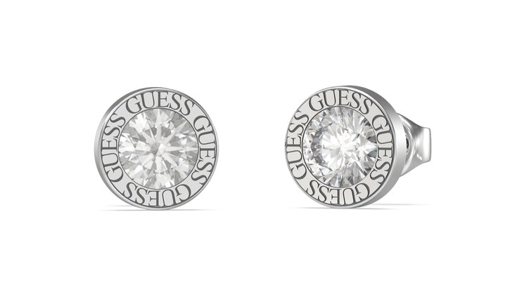 Módny dámsky náramok a náušnice značky Guess vyrobené z ušľachtilej chirurgickej ocele. Na náramku je guľatá ozdoba s vsadeným čírym kryštálom a nápisom značky Guess. Náramok má nastaviteľnú dĺžku 17-21 cm. Náušnice z chirurgickej ocele sú na puzetkové zapínanie o priemere 1cm v rovnakom tvare ako ozdoba na náramku.