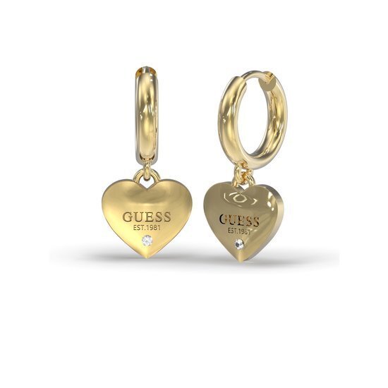 Dámske náušnice Guess JUBE03145JWYGT sú vyrobené z kvalitnej ušľachtilej ocele. Tento model kruhových náušníc sa pýši svojím príveskom v tvare srdca. Srdce s priemerom 13mm je doplnené o lesklý ozdobný kamienok a samotný názov značky. Zlaté farebné prevedenie týchto náušníc ľahko zladíte k iným módnym doplnkom.