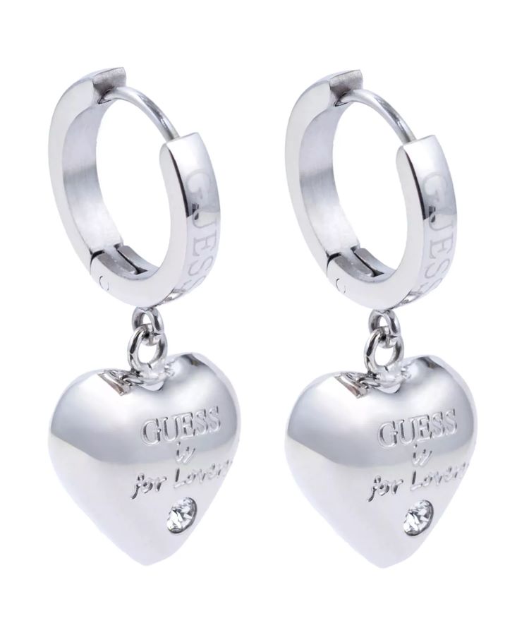 Guess Is For Lovers UBE70110 sú dámske náušnice s kryštálmi a príveskom v tvare srdca s vyrytým nápisom „Guess is for lovers“. Sú vyrobené z kvalitnej nehrdzavejúcej ocele v striebornom odtieni. Model s priemerom 16 mm má zapínanie na šnúrku do ucha a dvojročnú záruku výrobcu.