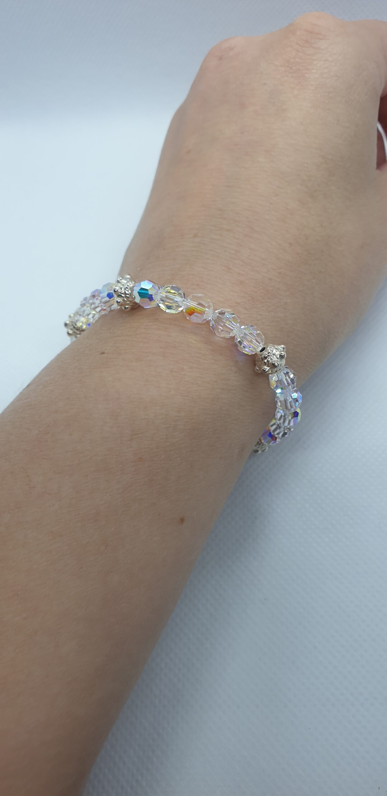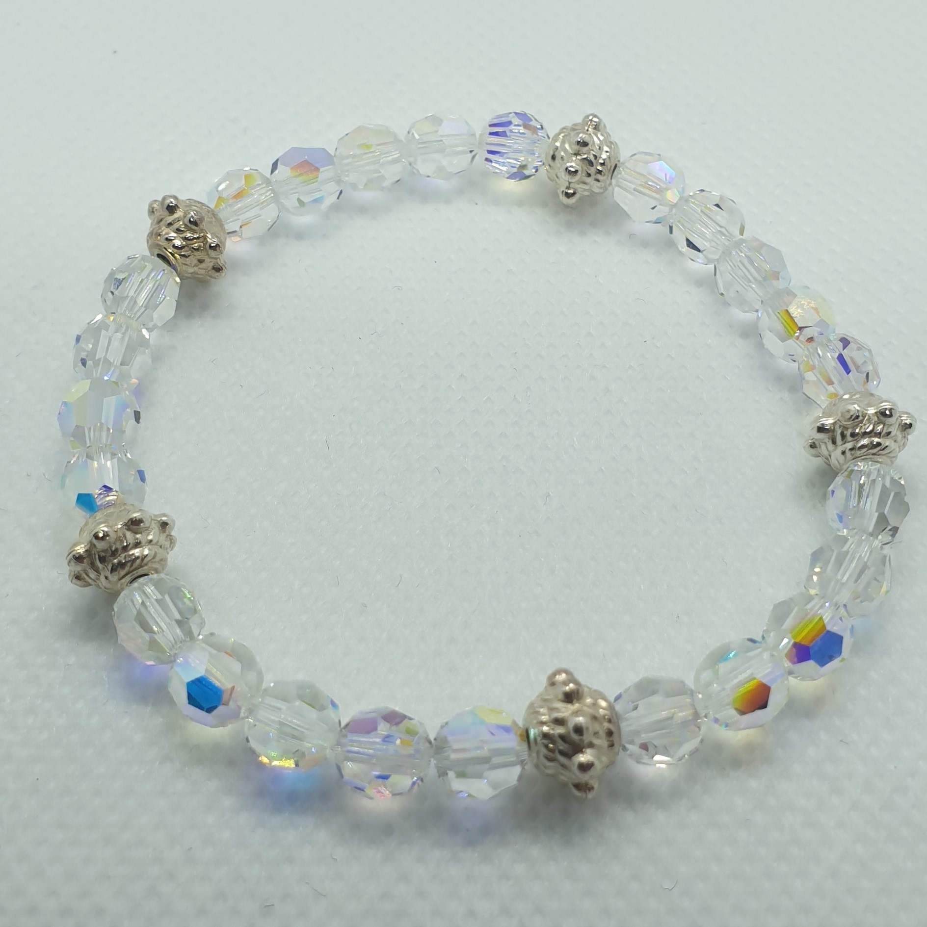 Nádherný kryštáľový náramok s korálkami Swarovski vo farbe crystal AB, každý vo veľkosti 6mm doplnený striebornými rondelkami. Náramok je elegantný a elastický, hodí sa na ruku o dĺžke 16 – 19 cm. Využijete ho na každodenné aj špeciálne príležitosti.