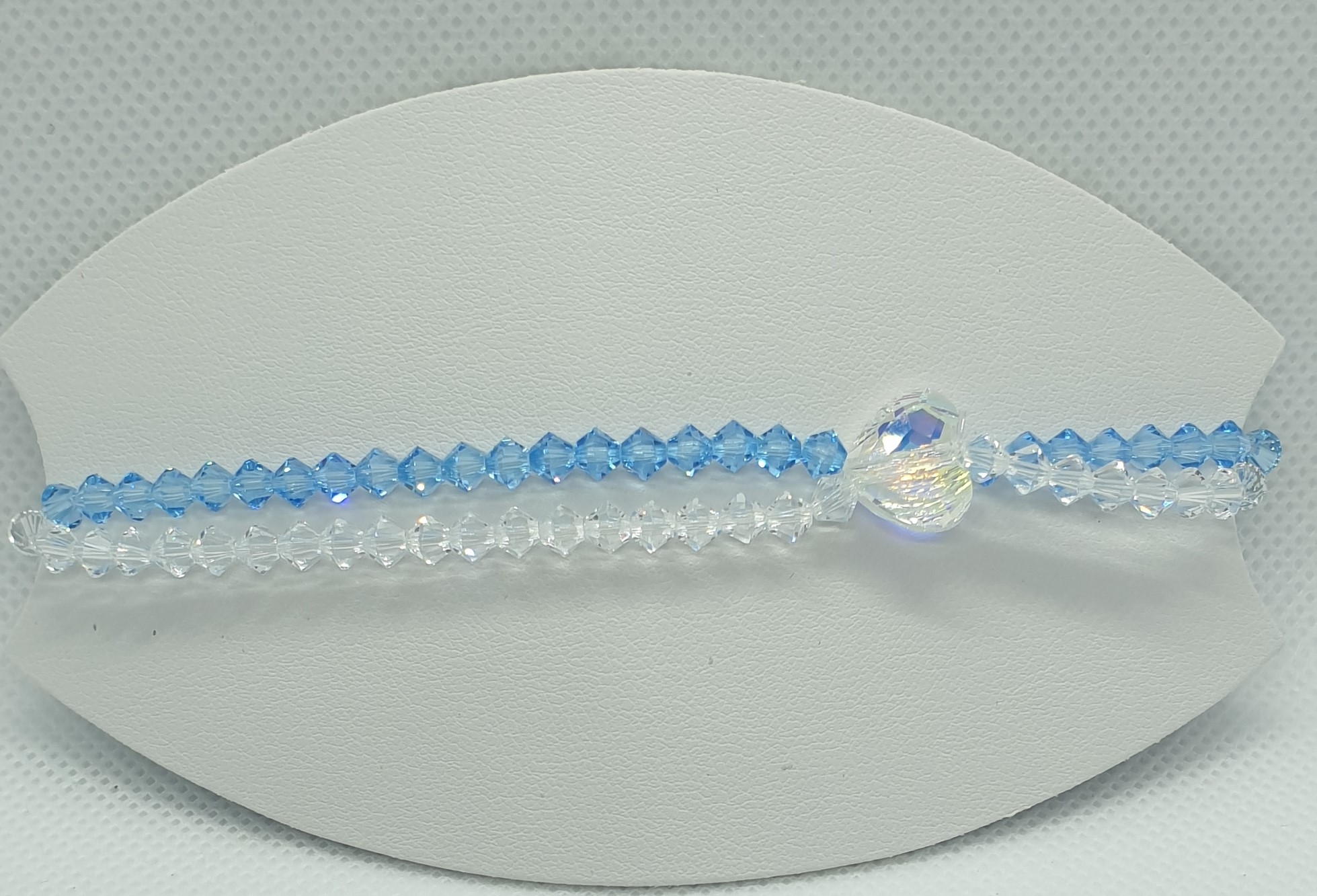 Nádherný dvojitý kryštáľový náramok s korálkami Swarovski vo farbe Aquamarine a Crystal, každý vo veľkosti 4mm, doplnený o srdce Crystal AB vo veľkosti 12mm. Náramok je elastický, hodí sa na ruku o dĺžke 17 – 19 cm. Využijete ho na každodenné aj špeciálne príležitosti.