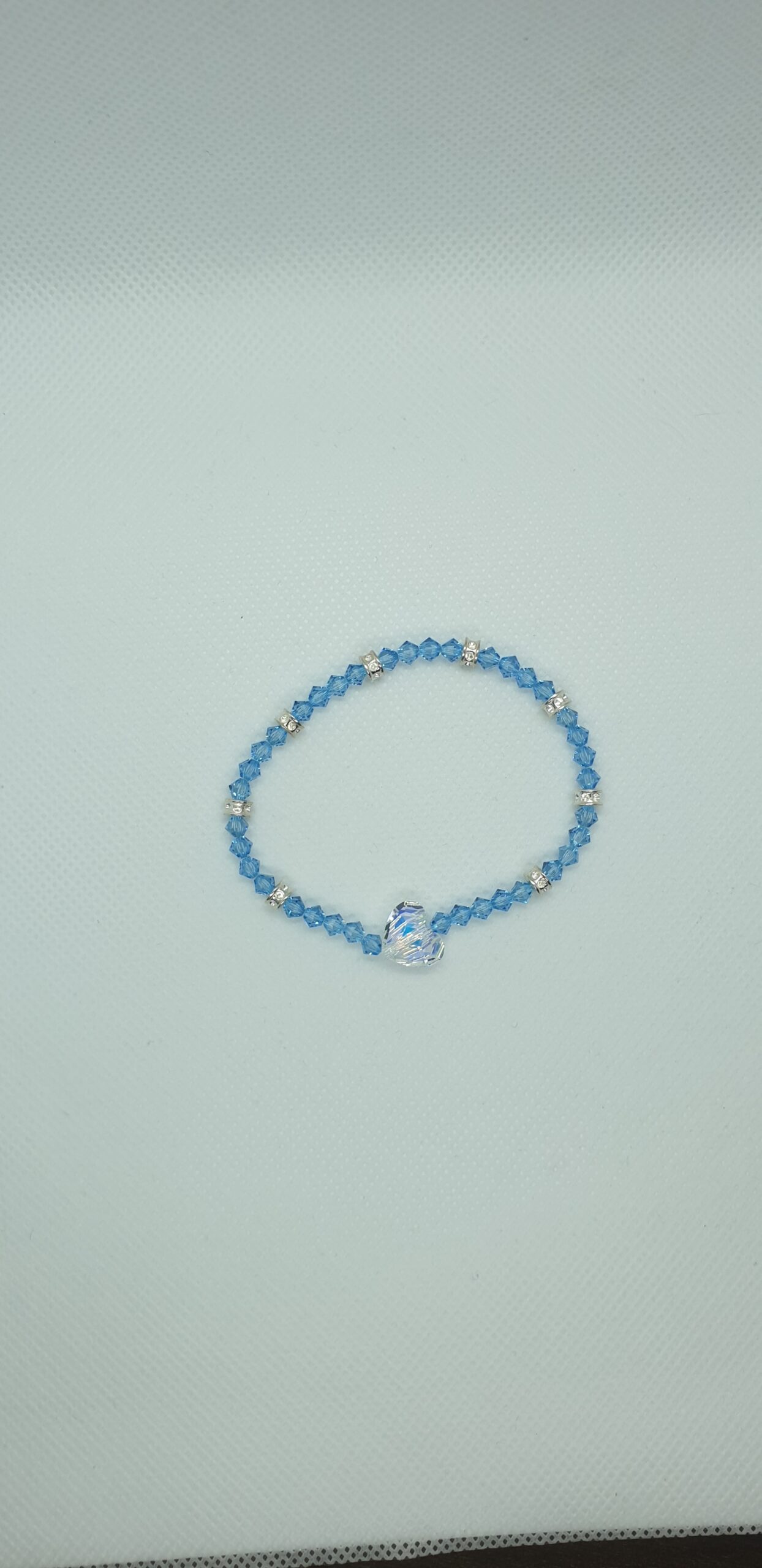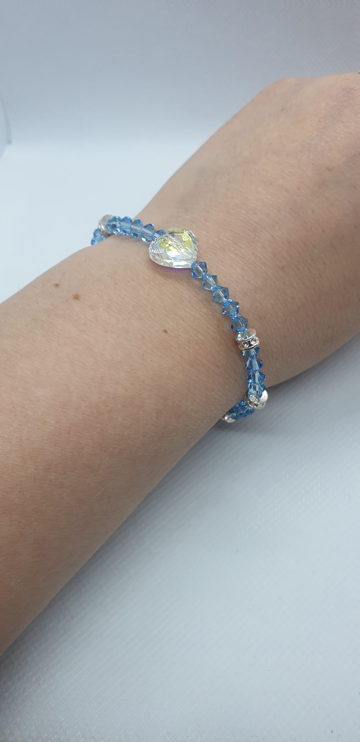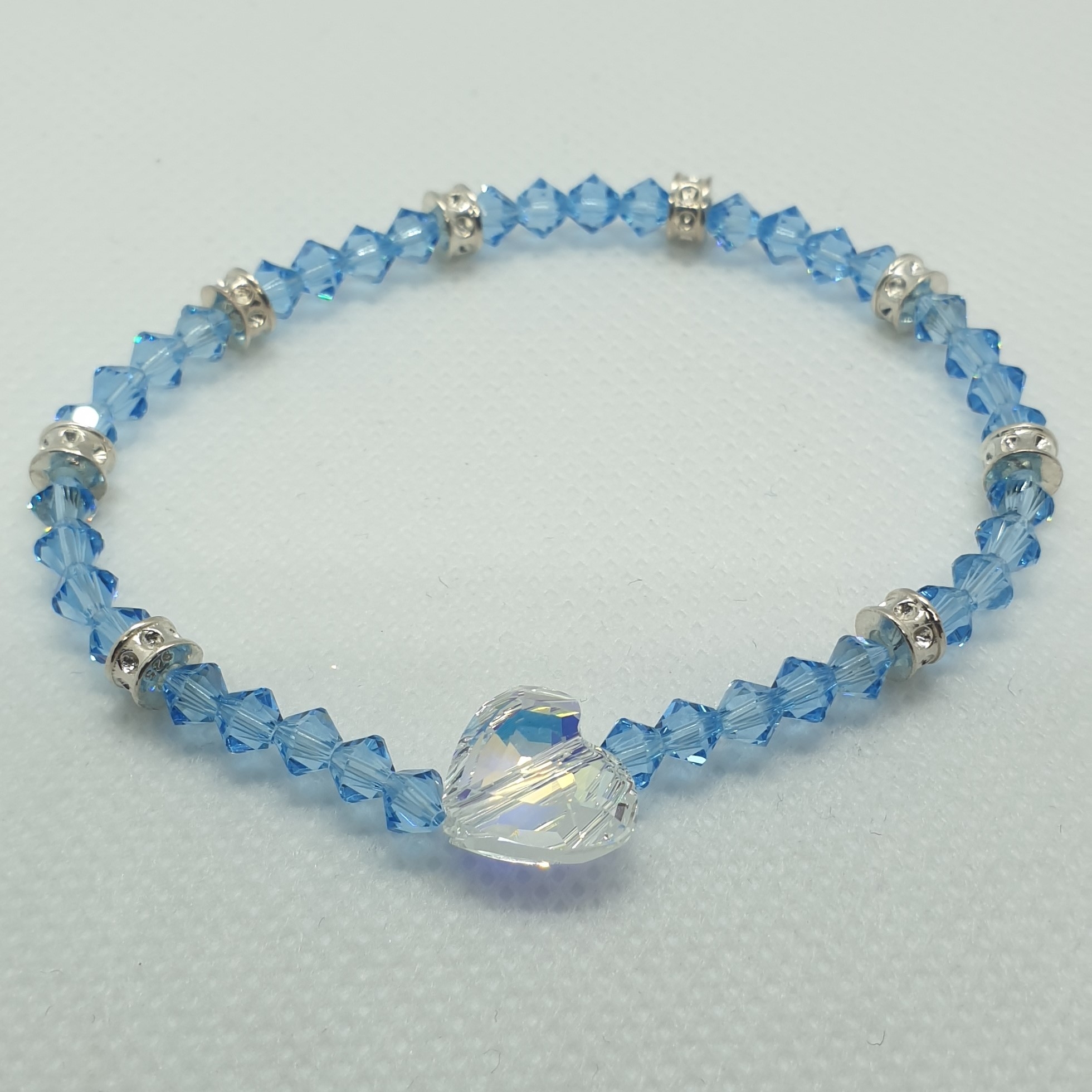Nádherný kryštáľový náramok s korálkami Swarovski vo farbe Aquamarine, každý vo veľkosti 4mm doplnený striebornými rondelkami farby Crystal a srdiečkom Swarovski vo farbe Crystal AB o veľkosti 12mm.Náramok je elastický, hodí sa na ruku o dĺžke 16 – 19 cm. Využijete ho na každodenné aj špeciálne príležitosti.
