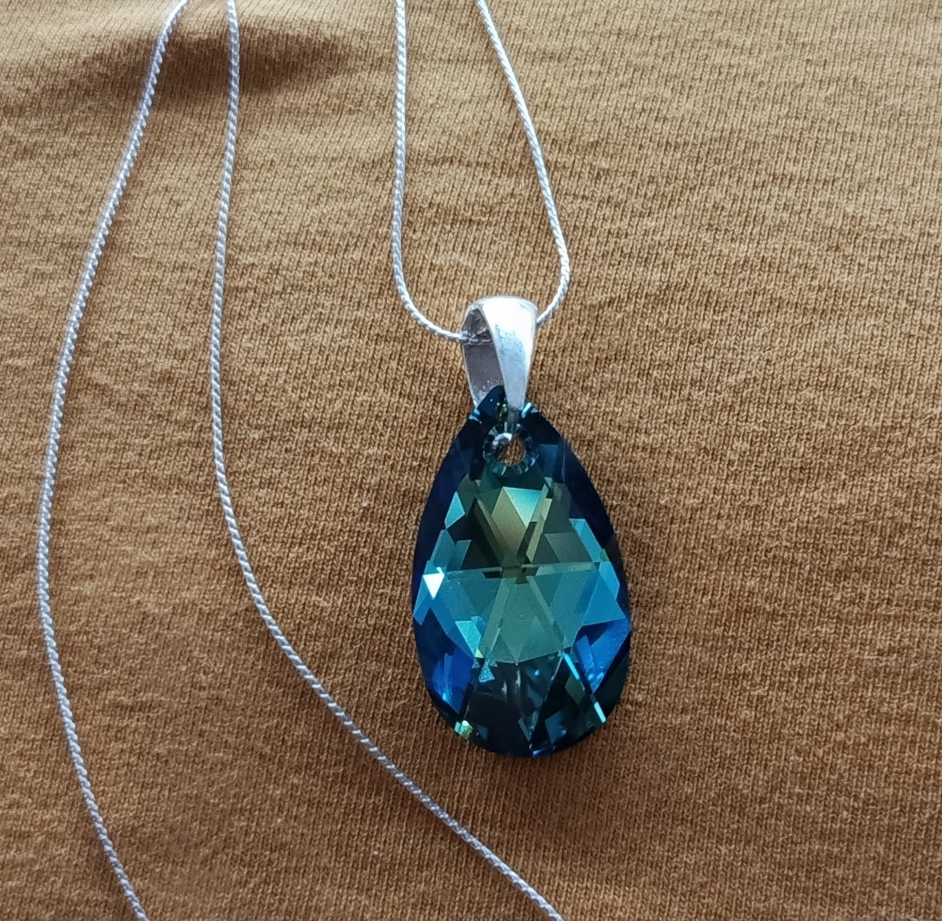 Kvalitné šperky z kryštálov Swarovski. Strieborná retiazka rhódiovaná (antialergická) so žiarivým príveskom Swarovski elements – Hruška. Retiazka má dĺžku 45cm a na nej je zavesený prívesok o veľkosti 28mm. V tomto náhrdelníku budete žiariť každý deň, pretože farba Bermuda Blue je výnimočná a všetkými obdivovaná.