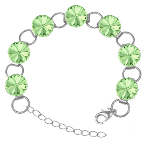 Kvalitné šperky z kryštálov SWAROVSKI. Kvalitný bižutérny náramok z kovu s povrchovou úpravou AG 925/100 – striebro so vsadenými kameňmi SWAROVSKI CRYSTALS tvar Rivoli o veľkosti 12mm farby CHRYSOLITE . Veľkosť náramku je nastaviteľná s predlžovacou retiazkou a začína na 18cm až do 23 cm. Tento náramok sa hodí na každodenné nosenie, ale aj na spoločenské podujatia a určite nesklame.