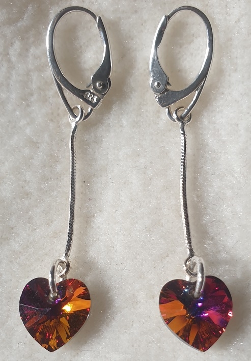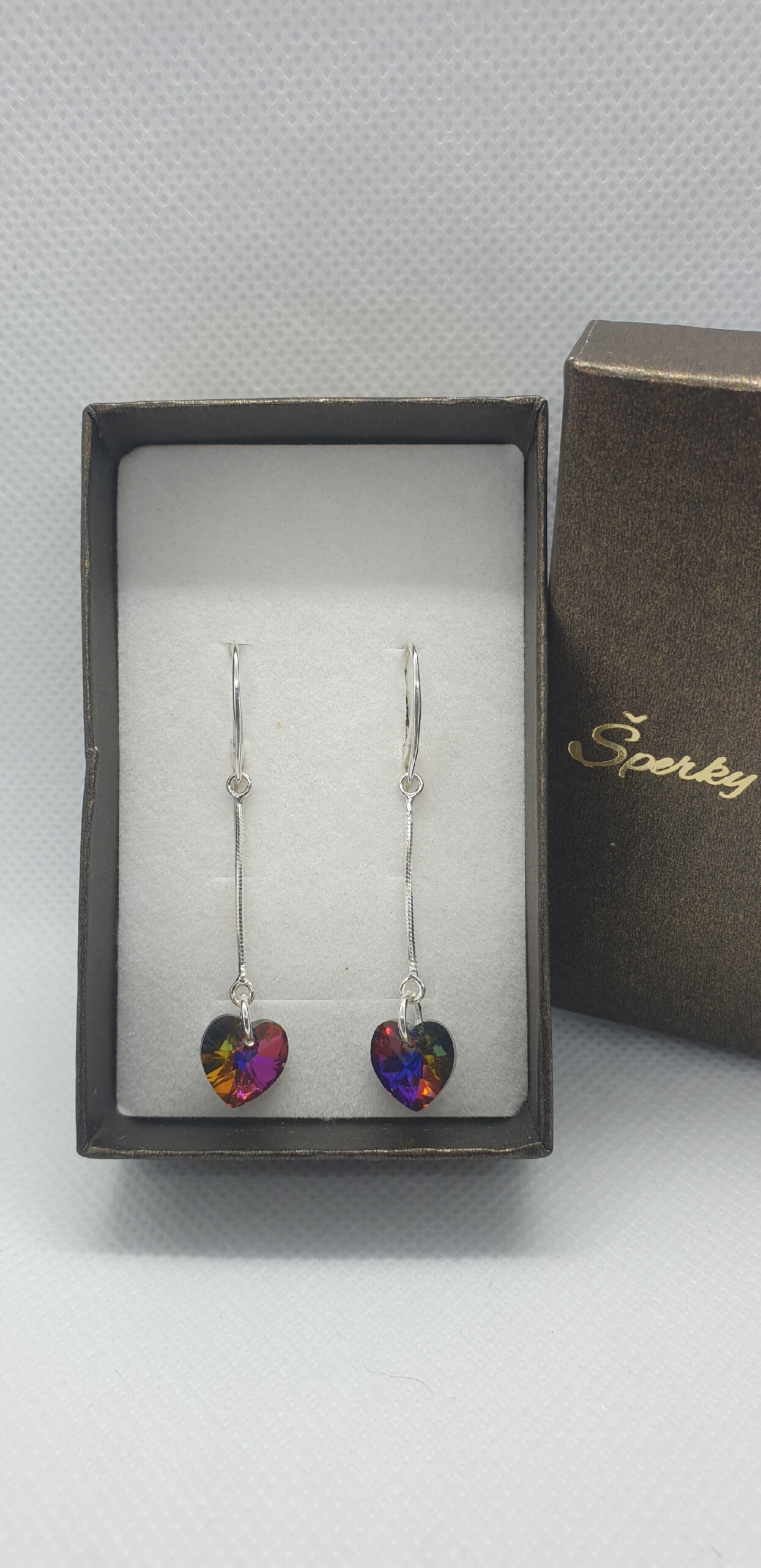 Kvalitné šperky z kryštálov Swarovski. Krásne visiace strieborné náušničky Swarovski elements srdiečko vo farebnom prevedení Volcano. Srdce má veľkosť 10mm, žiari všetkými farbami a celá náušnica má dĺžku 5cm.
