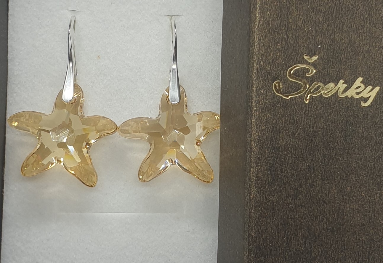 Kvalitné šperky z kryštáľov Swarovski. Strieborné náušnice zo Swarovski elements v tvare morskej hviezdy – Starfish vo farbe Golden Shadow o veľkosti 20mm. Veselé náušnice pre krajší deň.