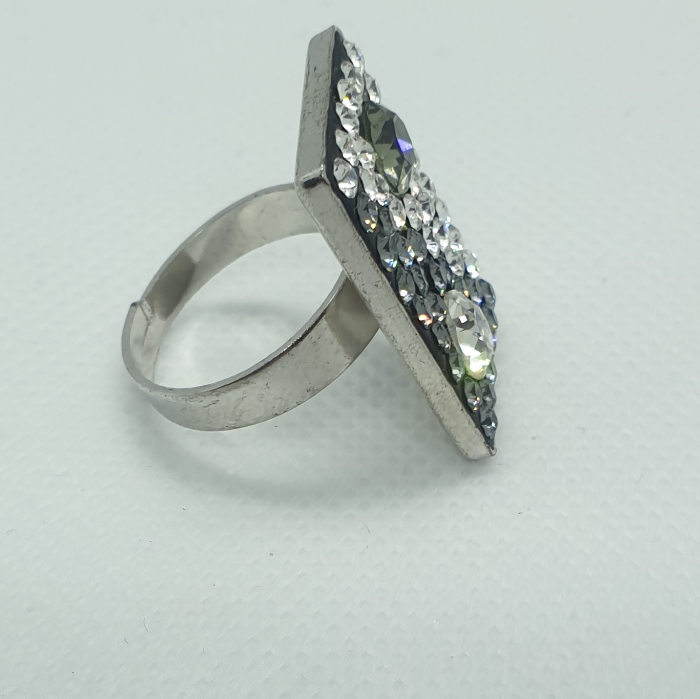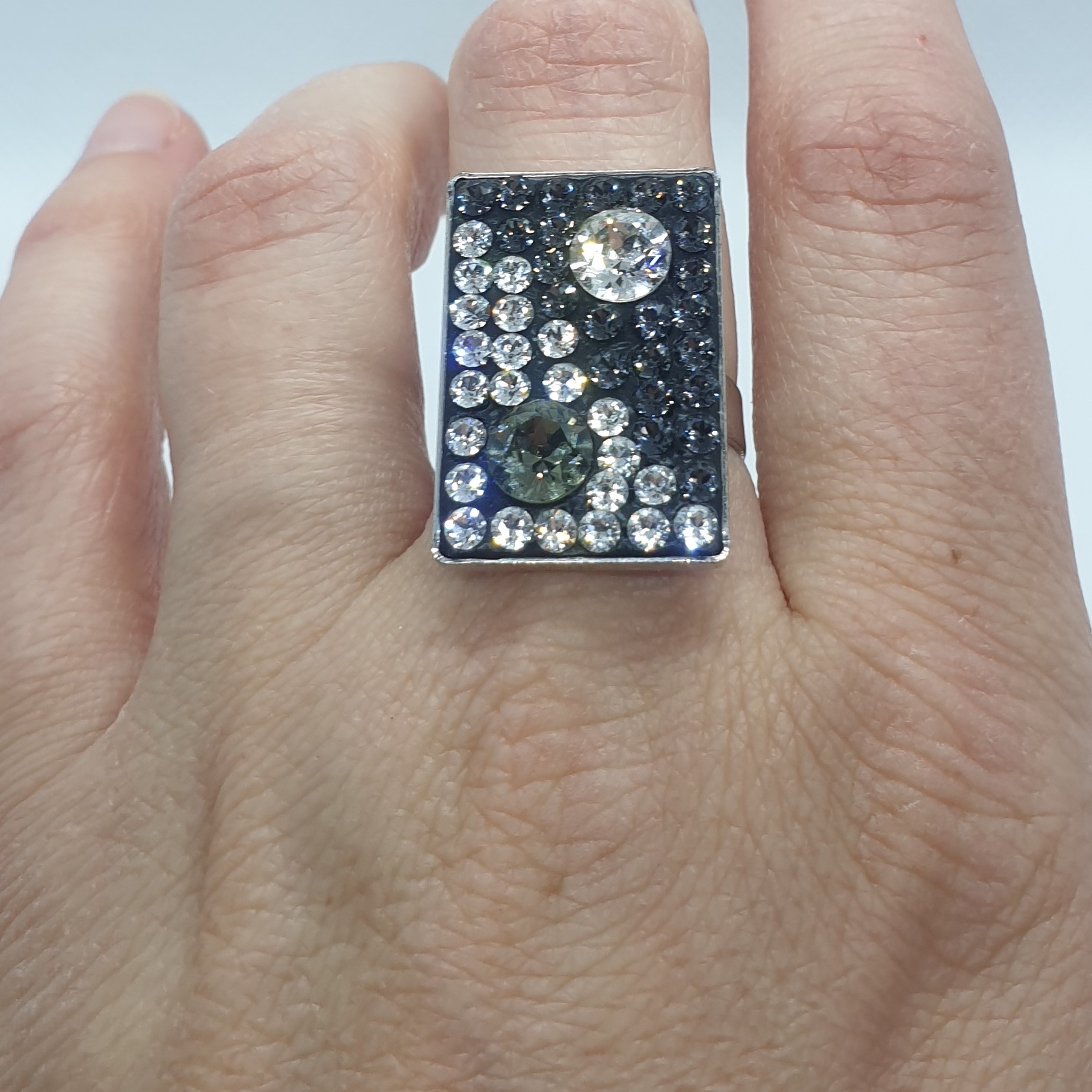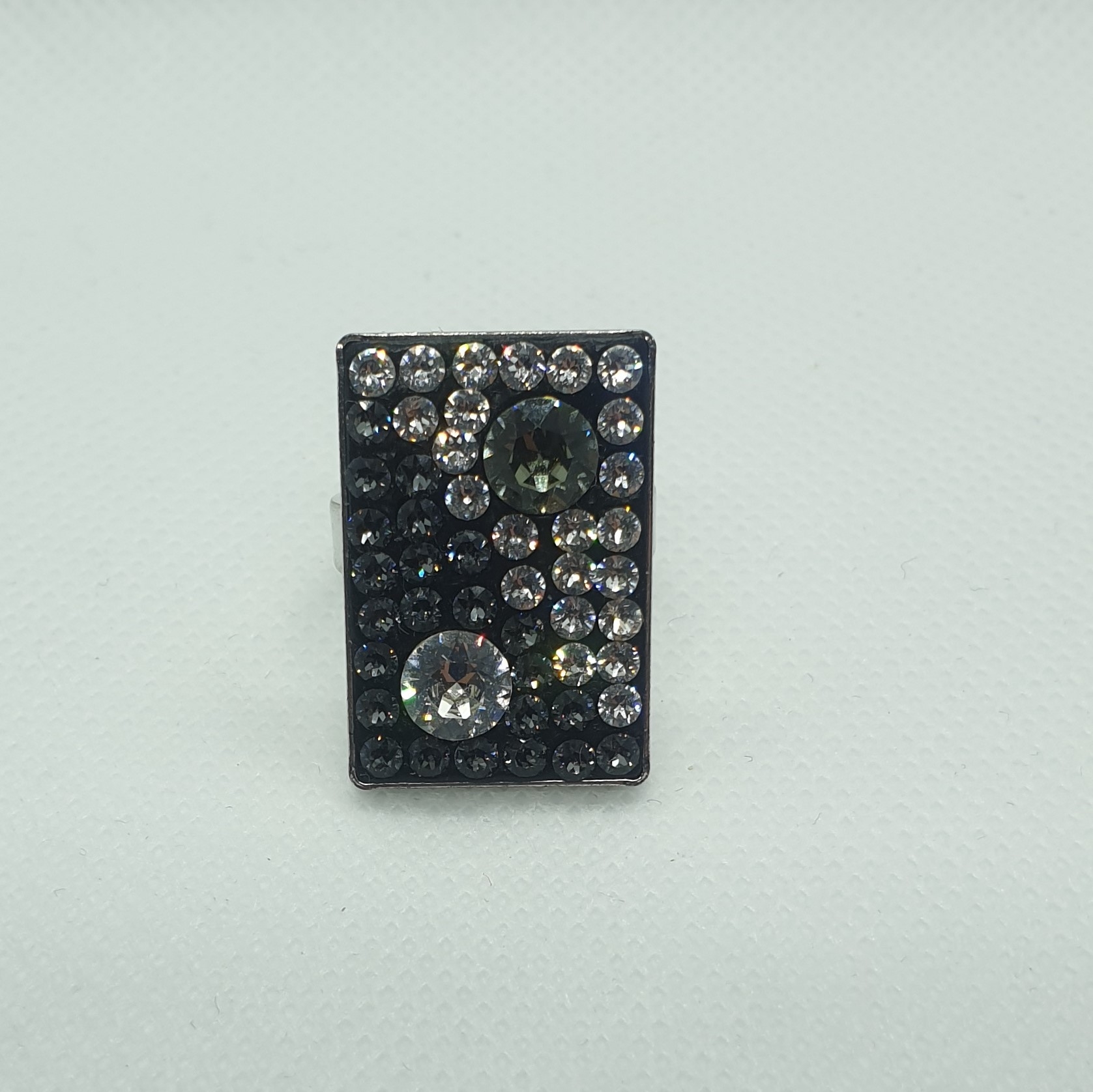 Kvalitné šperky s kryštálmi Swarovski. Mohutný prsteň v tvare odbĺžnika z obecného kovu s rhodiovanou úpravou v čiernočírom prevedení. Obdĺžník má rozmery 2,5×1,7cm. Nápadito ozdobí Vašu ruku a pritom o ňom nebudete vedieť ako príjemne sa nosí. Tento jedinečný kúsok si nenechajte ujsť. PRsteň má nastaviteľnú veľkosť cca od 56 – 60.