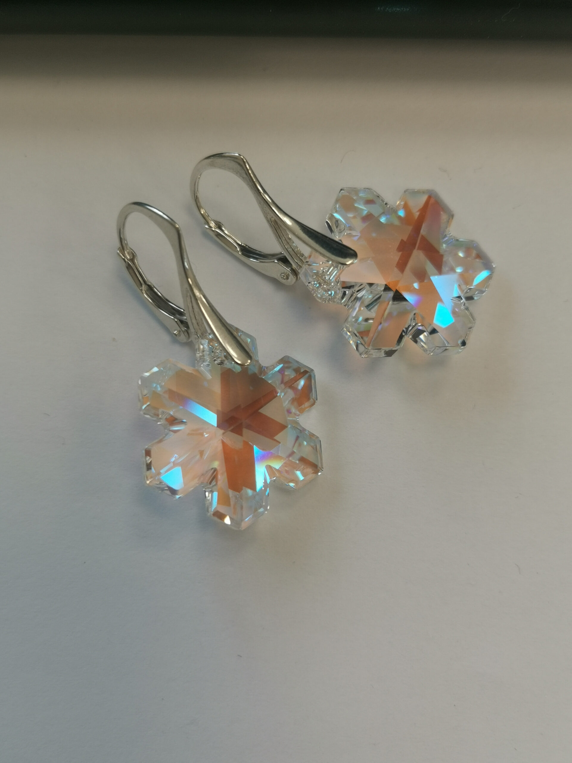 Kvalitné šperky z kryštálov Swarovski. Nežné a veselé strieborné náušnice vločky zo Swarovski elements v obľúbenej dúhovej farbe s modrým kontrastom Crystal Blue Auroris Boreale o veľkosti 20mm, vhodné ako darček.