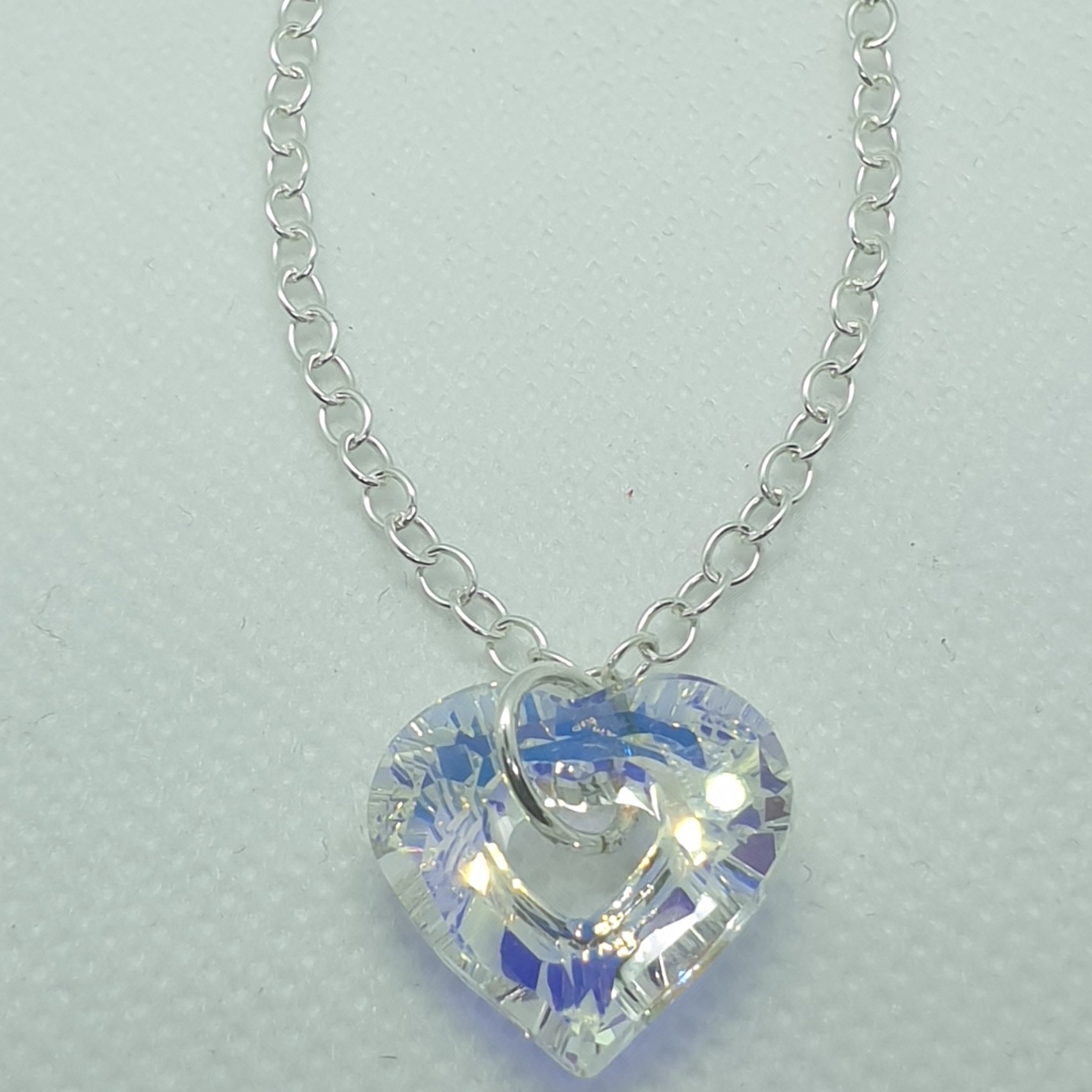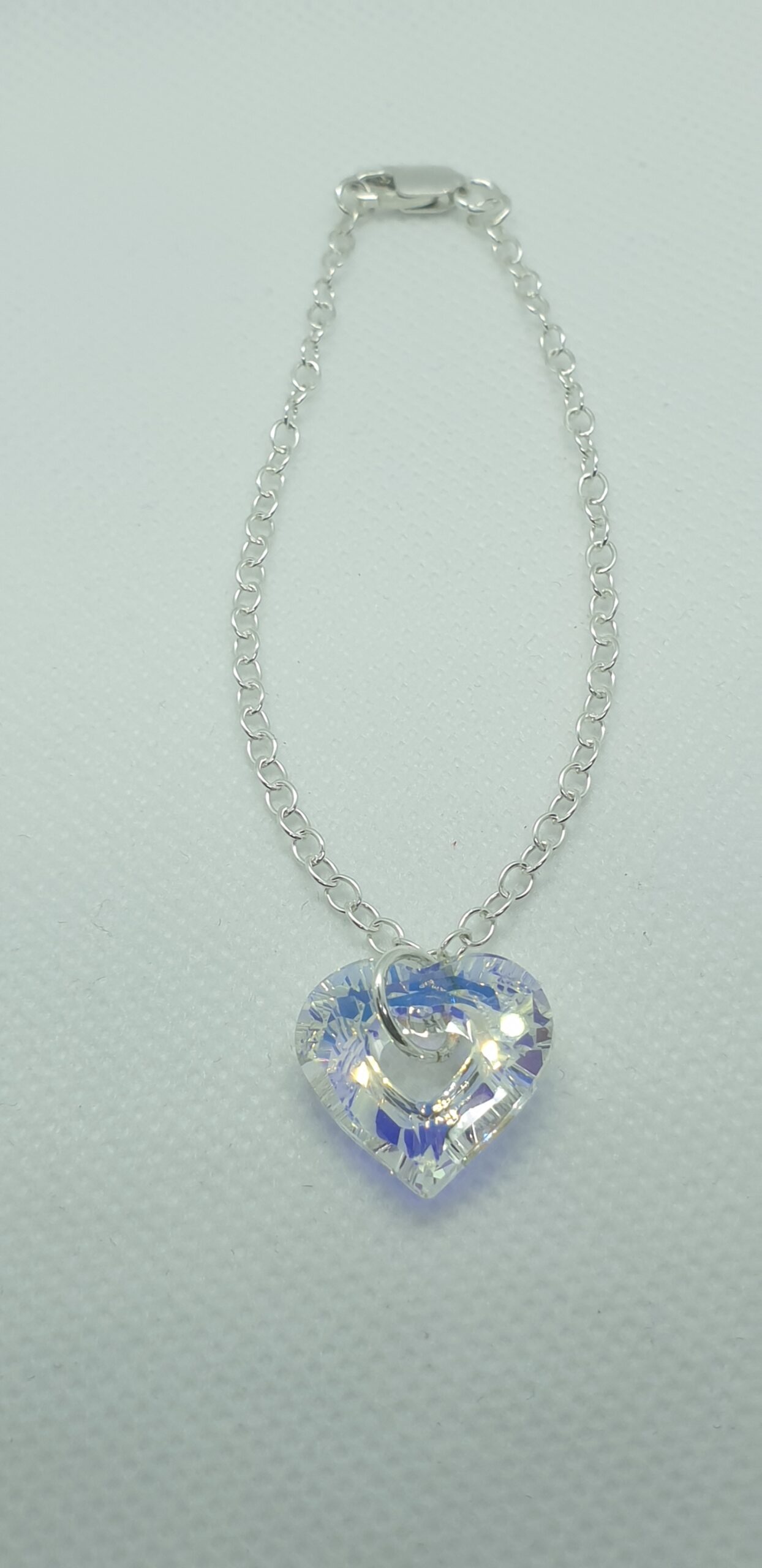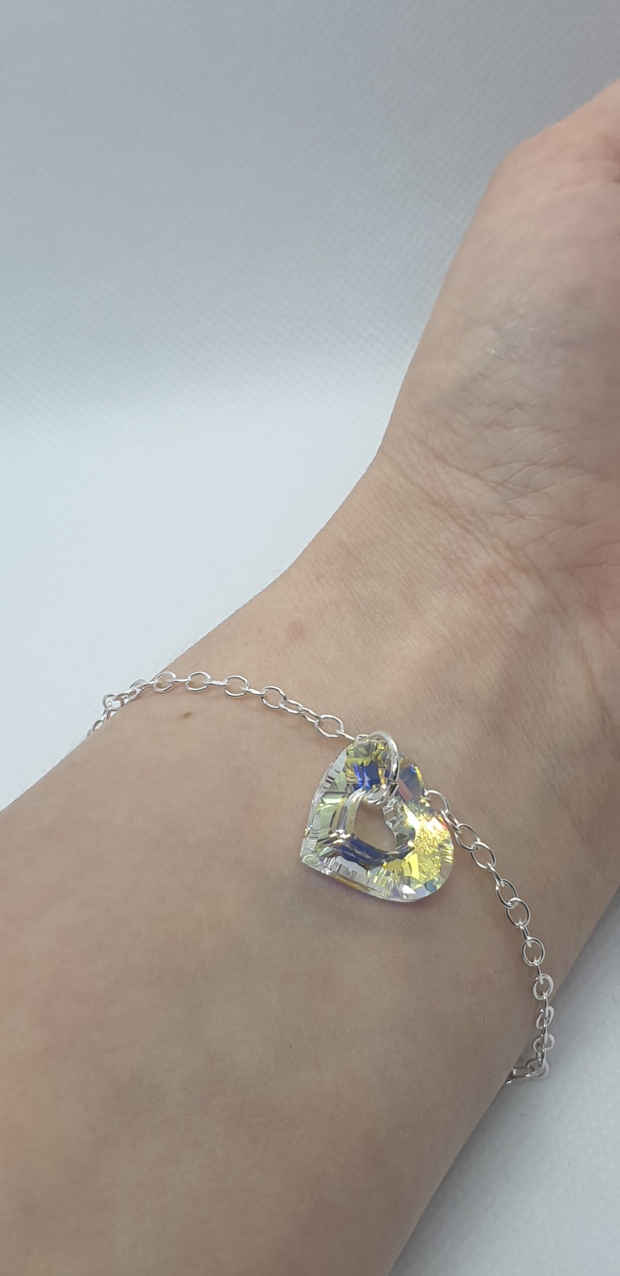 Kvalitné šperky z kryštálov Swarovski. Strieborný náramok o dĺžke 19cm s príveskom Swarovski elements-  Srdce v krásnej dúhovej farbe Crystal AB o veľkosti 14mm. Jemný náramok pre nežné ženy.