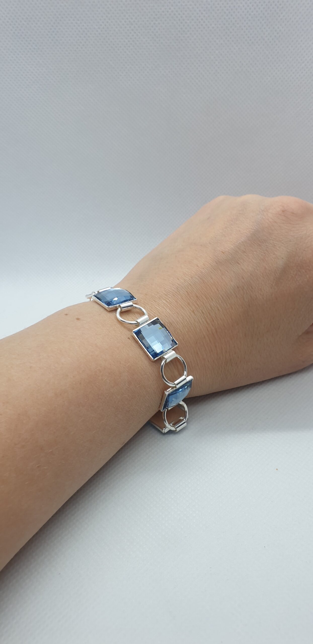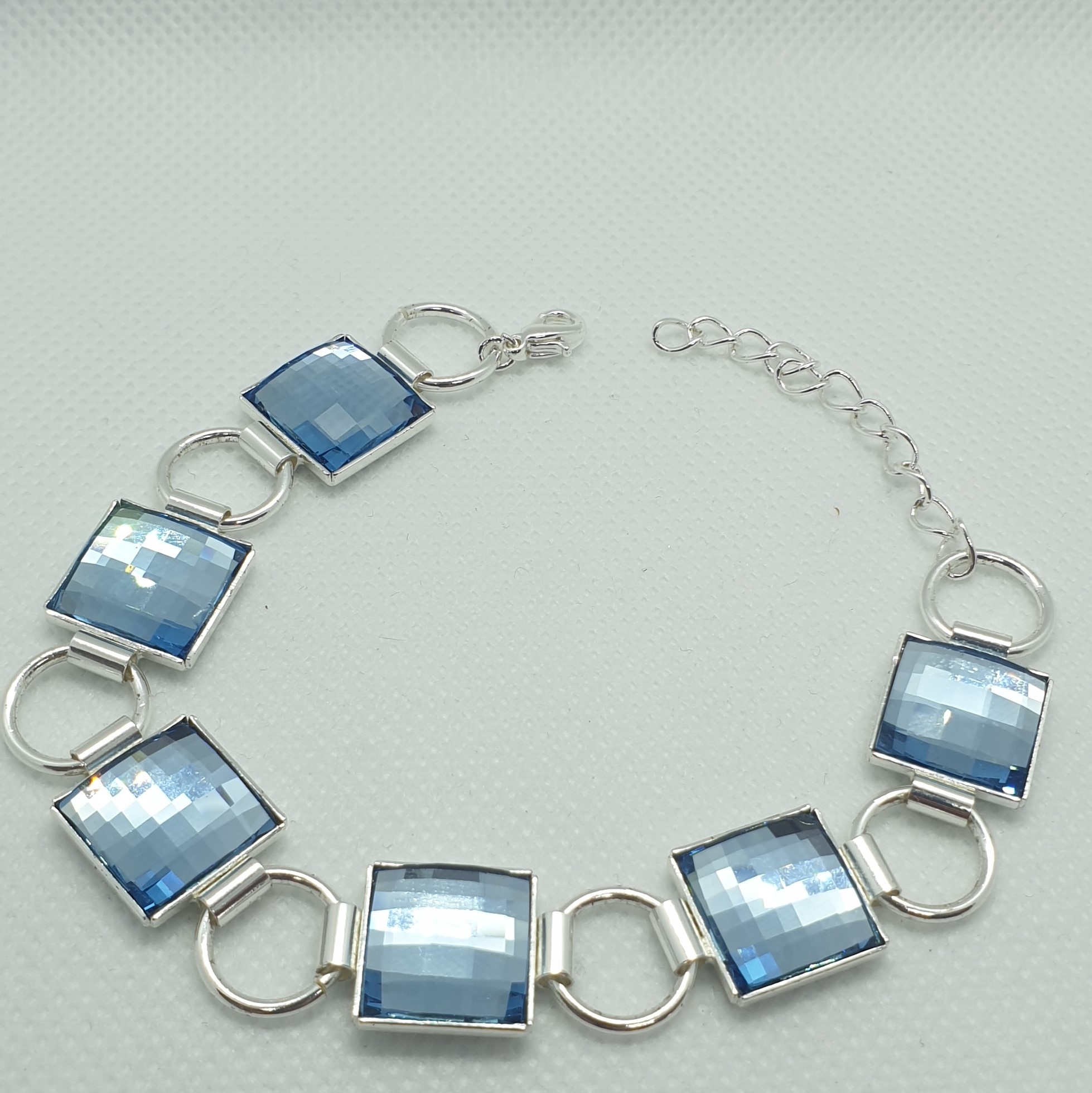 Kvalitné šperky s kryštálmi Swarovski. Krásny ligotavý náramok z kovu s povrchovou úpravou AG 925/1000 – striebro, so vsadenými kameňmi Swarovski Chessboard o veľkosti 12x12mm vo farbe Aquamarine. Týmto náramkom urobíte radosť každej dáme. Náramok má nastaviteľnú dĺžku vďaka predlžovacej retiazke od 18 – 23cm.
