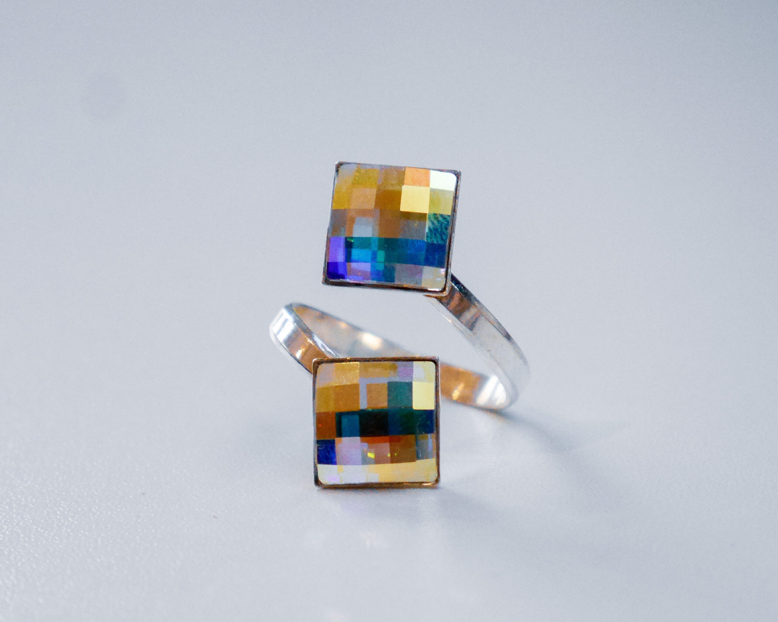 Kvalitné šperky z kryštálov Swarovski. Jedinečný prsteň zo striebra s nikdy nemiznúcim leskom kryštálov Swarovski typu Chessboard farby Crystal AB o veľkosti 10mm. Veľkosť prsteňa je nastaviteľná cca v rozsahu 53-59.