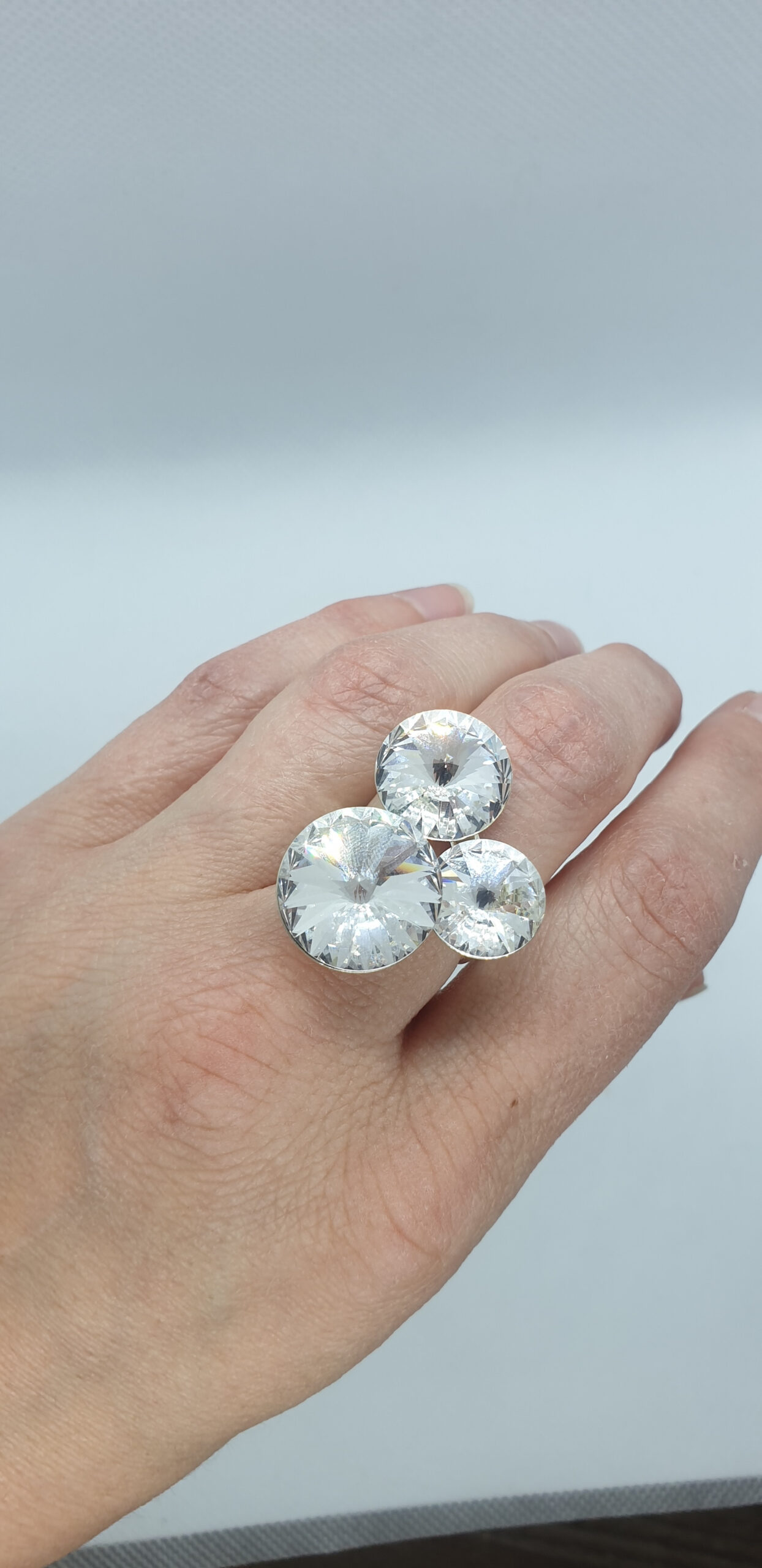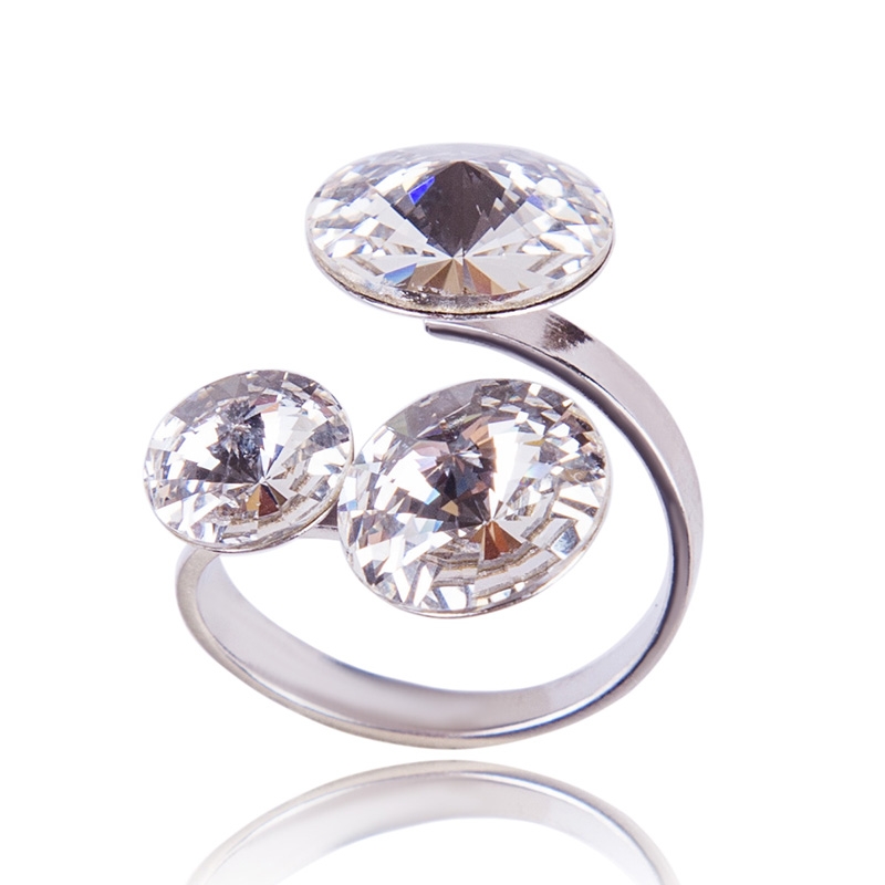 Kvalitné šperky z kryštálov Swarovski. Krásny strieborný prsteň s tromi kameňnmi Swarovski Crystals tvar Rivoli vo farbe Crystal o veľkosti 16mm, 14mm a 12mm Vám rozžiari Váš deň. Veľkosť prsteňa je nastaviteľná cca v rozsahu 53-59.